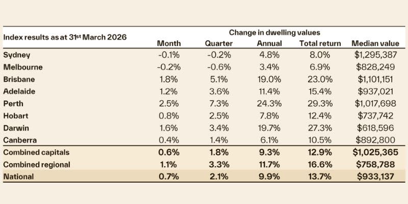 According to Cotality’s latest national home value index, values rose 0.7 per cent in March—up slightly from 0.6 per cent in February—taking home values 2.1 per cent higher for the first quarter of the year.