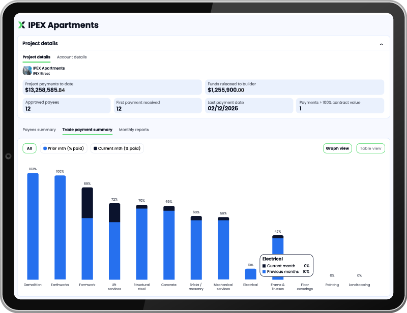 IPEX enables developers and lenders to link payment to progress by providing real-time visibility over who has been paid (and who has not), preventing liabilities from quietly accumulating.
