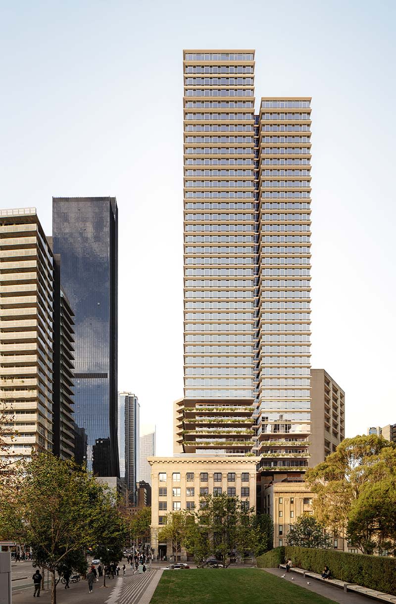 A 42-storey tower has been approved to rise from the former State Savings Bank of Victoria site, incorporating and restoring two heritage-listed buildings—the 1924 banking chamber and the former Batman’s Hill Hotel—into a new residential, commercial and retail precinct at the western end of the CBD.
